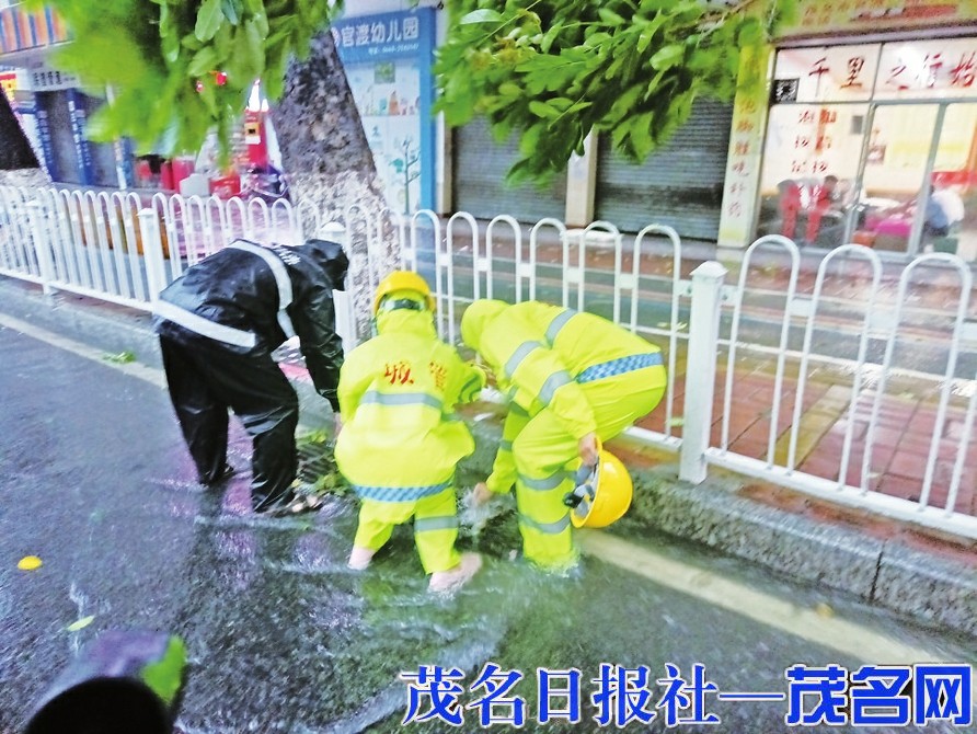 城管防风防汛人员及时排除下水井险情。(茂名城管供图)