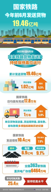新华社北京7月2日电(樊曦、徐皓冰)记者2日从中国国家铁路集团有限公司获悉,今年1至6月份,国家铁路货物发送量持续保持高位运行,累计发送货物 19.46 亿吨,同比增加1.02亿吨、增长5.5%,日均货物发送量等多项货运指标创造历史纪录。