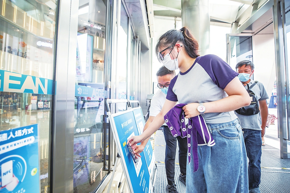 7月4日,在重庆两江新区一购物公园内,顾客使用NFC功能完成入场登记。