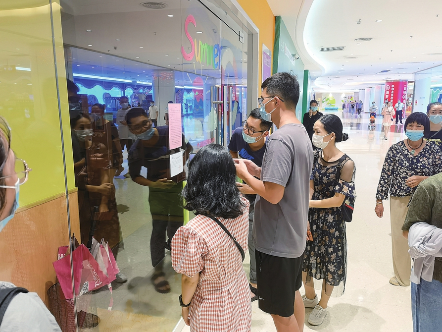 家长们仔细查看金宝贝门店张贴的停业告示。茂名晚报记者张丁文摄