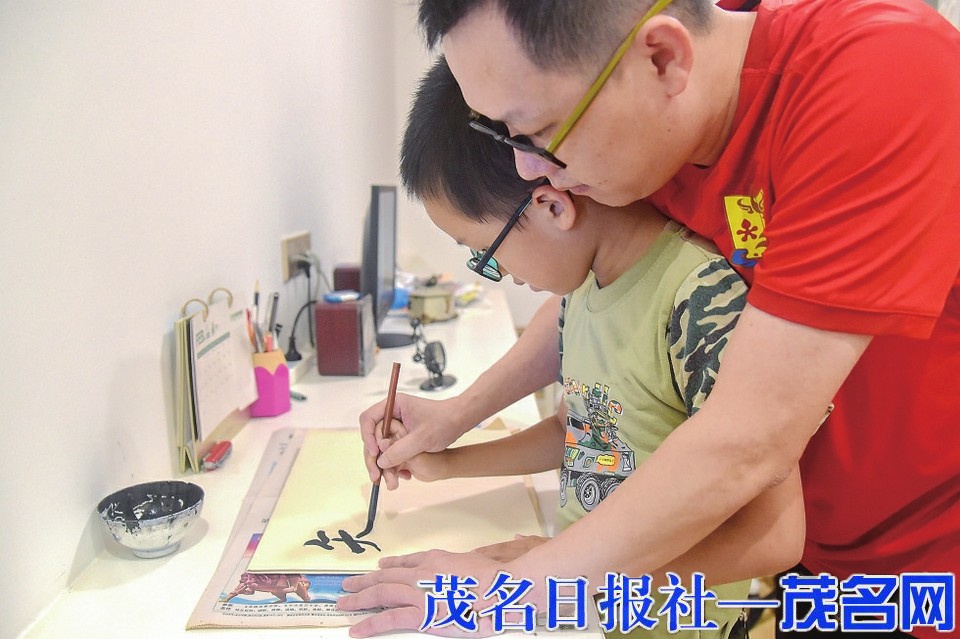 黄元柱在陪孩子练习书法。