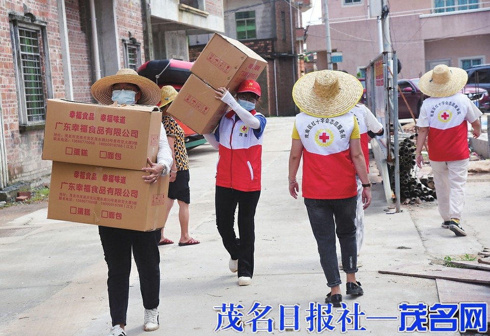 红十会志愿者运送救灾物资到禾步村。茂名日报社全媒体记者黄信涛摄