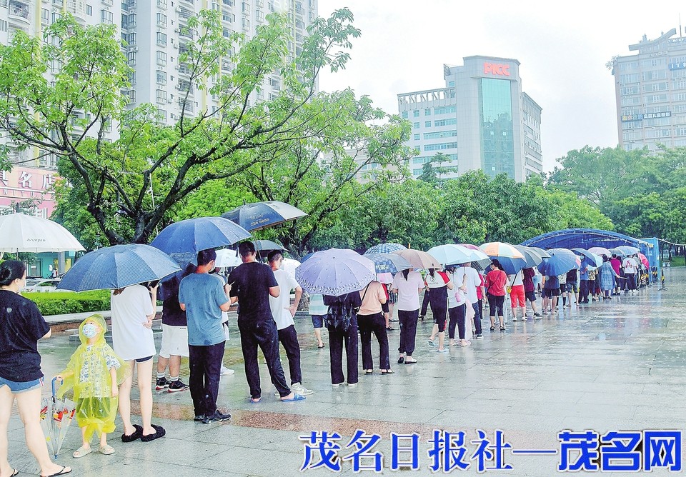 市民冒雨有序排队核酸采样。茂名日报社全媒体记者陈国汉摄