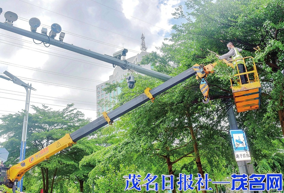 昨日,记者在市区油城路与西粤路交汇处看到,园林工人正在对遮挡交通信号灯、路牌的路树枝叶进行及时修剪,确保道路车辆行人通行安全。