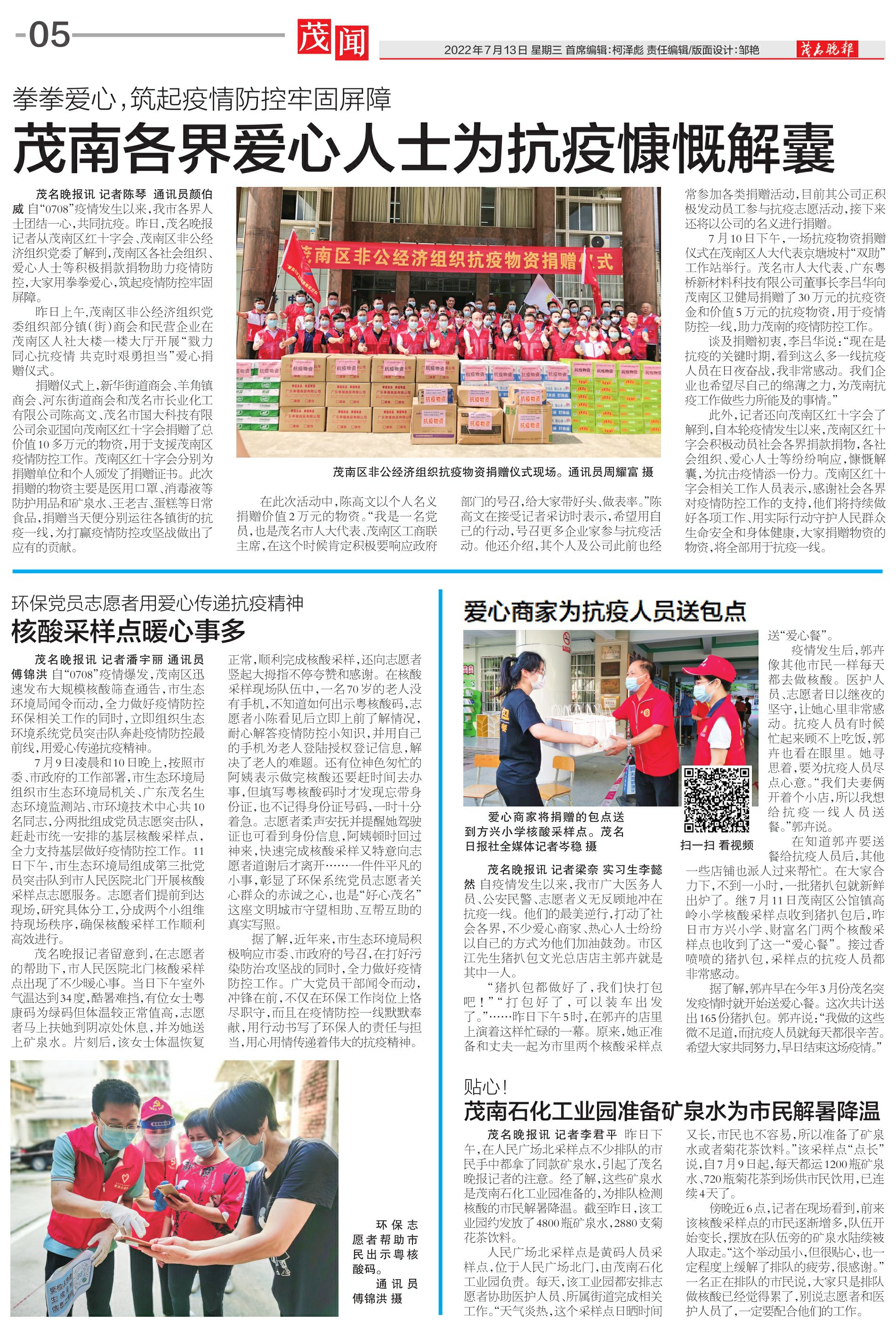 茂名晚报讯记者潘宇丽通讯员傅锦洪自“0708”疫情爆发,茂南区迅速发布大规模核酸筛查通告,市生态环境局闻令而动,全力做好疫情防控环保相关工作的同时,立即组织生态环境系统党员突击队奔赴疫情防控最前线,用爱心传递抗疫精神。
