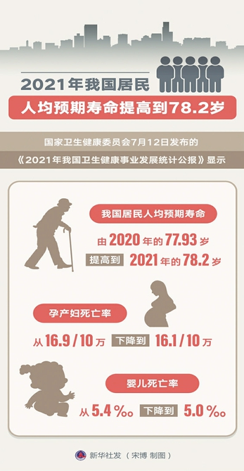 新华社北京7月12日电国家卫生健康委员会12日发布的《2021年我国卫生健康事业发展统计公报》显示,我国居民人均预期寿命由2020年的77.93岁提高到2021年的78.2岁,孕产妇死亡率从16.9/10万下降到16.1/10万,婴儿死亡率从5.4‰下降到5.0‰。