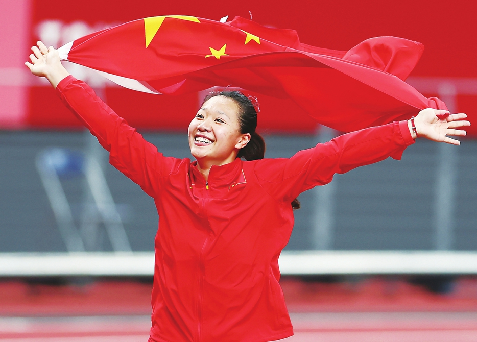 2021年8月6日,刘诗颖在东京奥运会田径女子标枪决赛中夺得冠军庆祝胜利。新华社记者兰红光摄