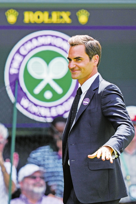 7月3日,瑞士选手费德勒在庆典活动上。当日,2022温布尔登网球公开赛举行中央球场建成100周年庆典活动。新华社发