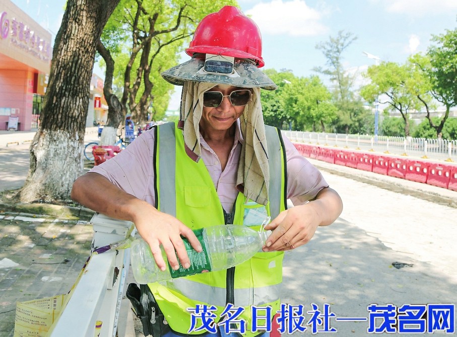 施工人员做足防晒补水措施预防中暑。茂名日报社全媒体记者李颜东摄