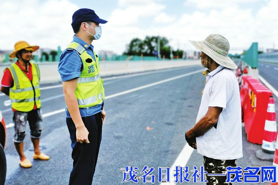 7月12日11时30分,茂名路政中队接高速交警通知,在茂湛高速改扩建施工路面(浅水-鳌头段)发现一名老伯骑自行车前行。路政员易建东、翁封剑马上赶往现场,同时通知施工标段安全协管员做好拦截引导。