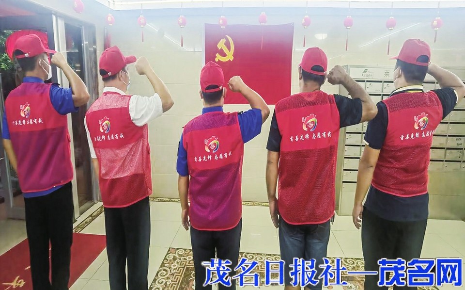 7月11日,茂南区城南街道综合行政执法办公室主任蓝家宇和4名党员面向党旗庄严宣誓,誓言进入疫情最严重区域,逐家逐户开展核酸筛查,保证完成任务。
