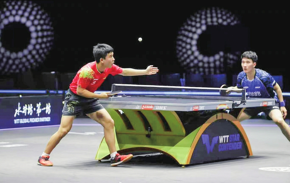 7月13日,向鹏(左)在比赛中。图源:世界乒乓球职业大联盟官方微博
