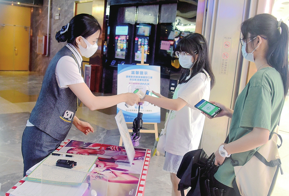 观影者须佩戴口罩、测温并扫描场所码后进场。 茂名日报社全媒体记者陈国汉摄