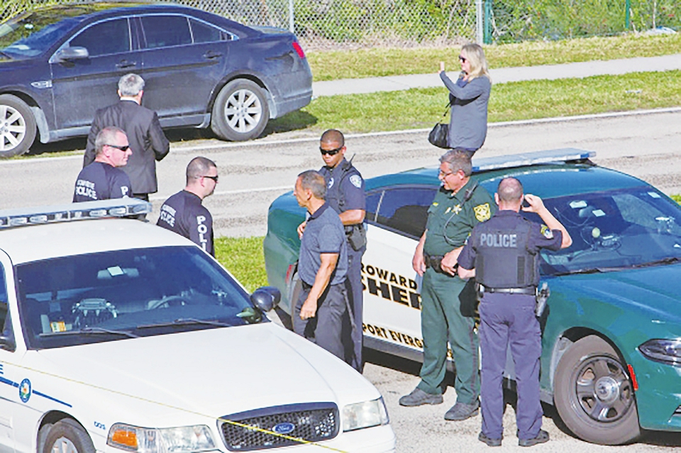 2018年2月15日,在美国佛罗里达州南部帕克兰市,警察在发生枪击事件的一所高中附近执勤。 新华社发(莫妮卡摄)