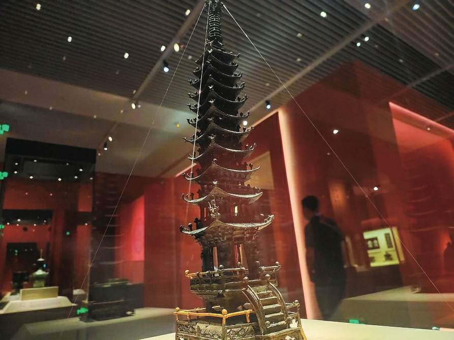 这是展出的韩国青铜多层小塔(7月26日摄)新华社记者金良快摄
