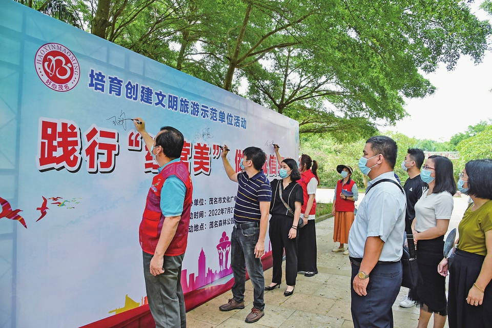 茂名晚报讯记者潘宇丽 昨日上午,为贯彻落实创建全国文明城市工作要求,持续开展文明旅游示范单位创建工作,市文化广电旅游体育局率队到国家AAAA级旅游景区广东茂名森林公园开展2022年茂名市“诚信旅行社”诚信典型宣传主题实践活动,把诚信教育融入企业管理和经营过程中,大力倡导弘扬行业诚信自律和企业诚实守信、依法经营,全面提升文化旅游行业服务水平。茂名市国旅国际旅行社有限公司、茂名市交通建设投资集团有限公司有关负责人和工作人员参加活动。