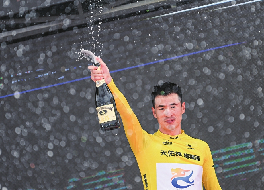 7月31日,平潭国际旅游岛洲际队选手刘建坤身着代表个人总成绩第一名的黄色领骑衫在领奖台上庆祝。新华社记者张龙摄