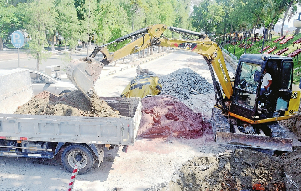 8月1日,市区滨河北路停车场新能源汽车充电桩建设工程动工,施工人员正在进行充电桩基础施工。该工程完成后,市民充电更方便快捷。