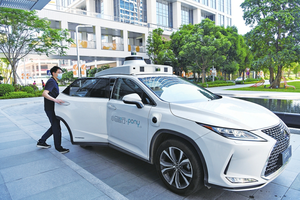 8月1日,在深圳前海,一名乘客体验乘坐小马智行自动驾驶汽车。
