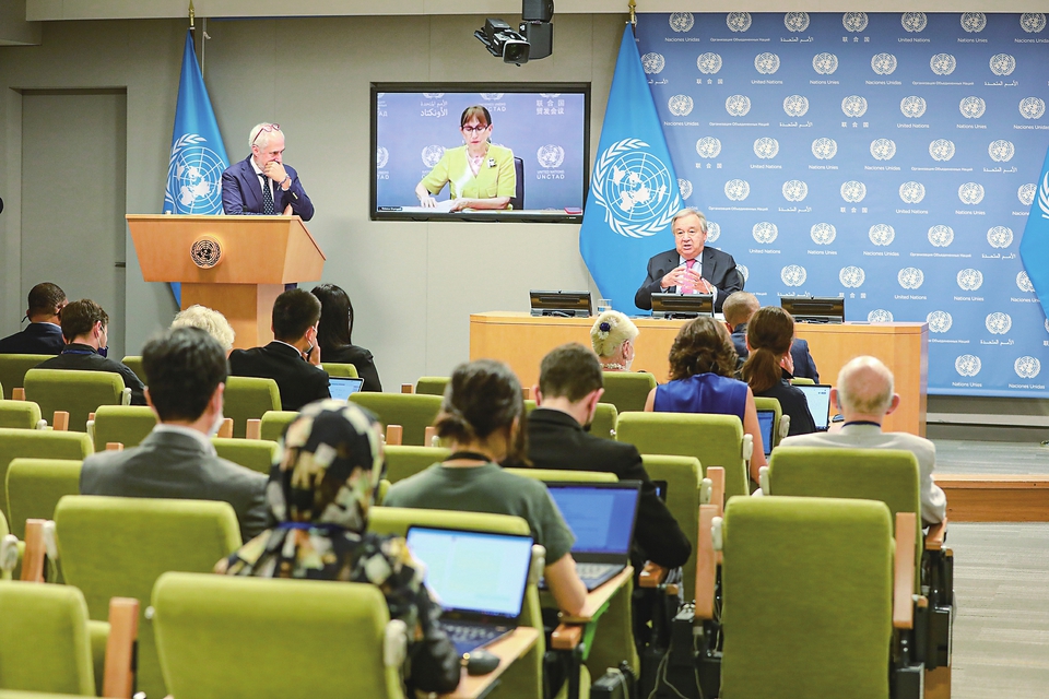 8月3日,在位于纽约的联合国总部,联合国秘书长古特雷斯(后右)出席联合国全球粮食、能源和金融危机应对小组第三次报告发布会。新华社记者谢锷摄
