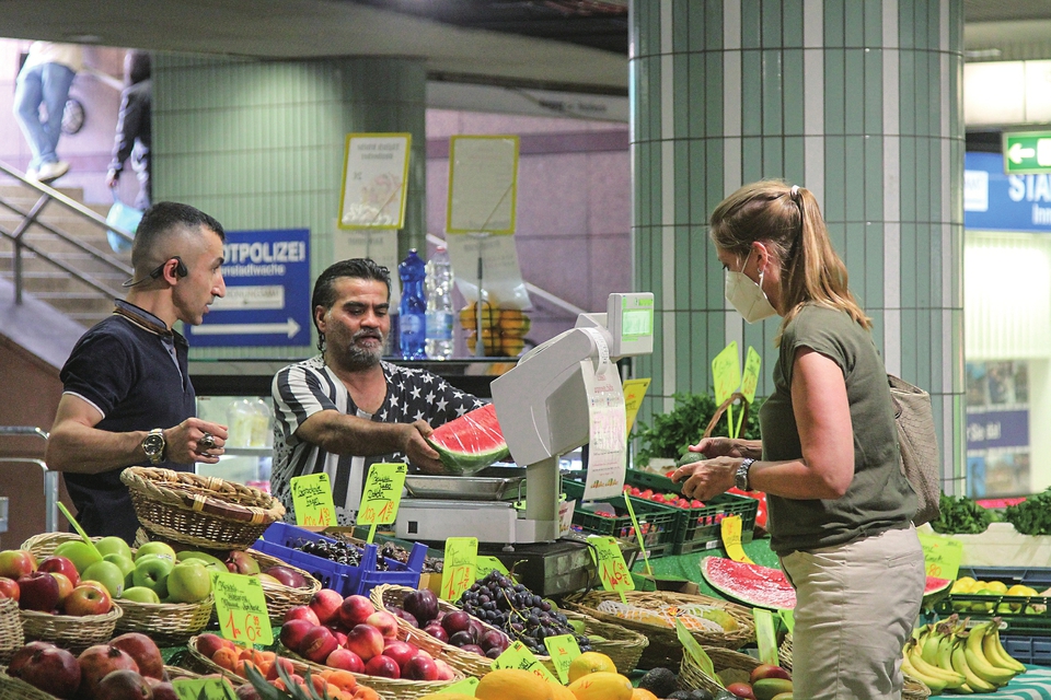 8月2日,顾客在德国法兰克福一家摊位前购买水果。新华社记者单玮怡摄