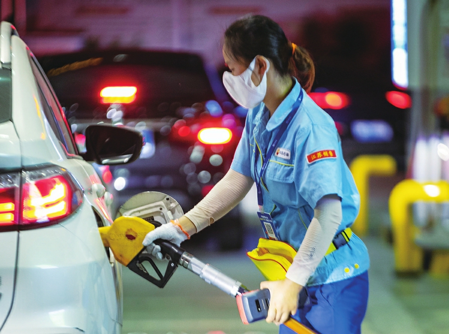 8月9日,在江苏省泰州市一家加油站,工作人员为汽车加油。新华社发汤德宏摄