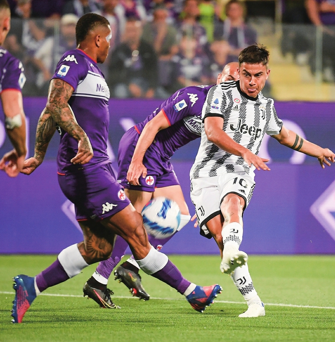 5月21日,尤文图斯队球员迪巴拉(右)在与佛罗伦萨队的比赛中拼抢。新华社发(费德里科·塔尔迪托摄)