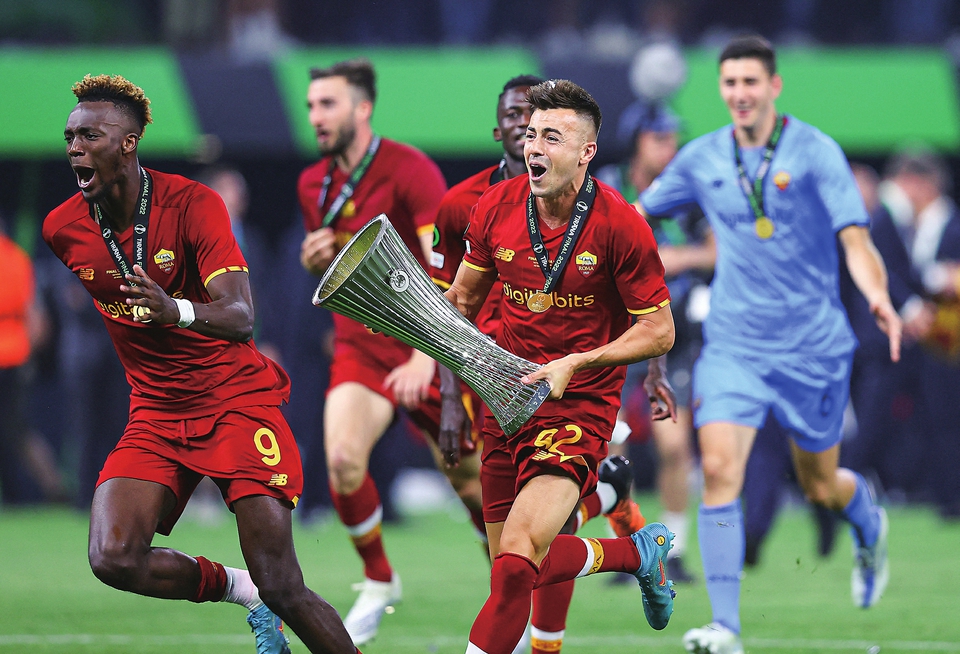 5月25日,在2021-2022赛季欧足联欧洲协会联赛决赛中,意甲罗马队以1比0战胜荷兰费耶诺德队,夺得冠军。新华社/路透