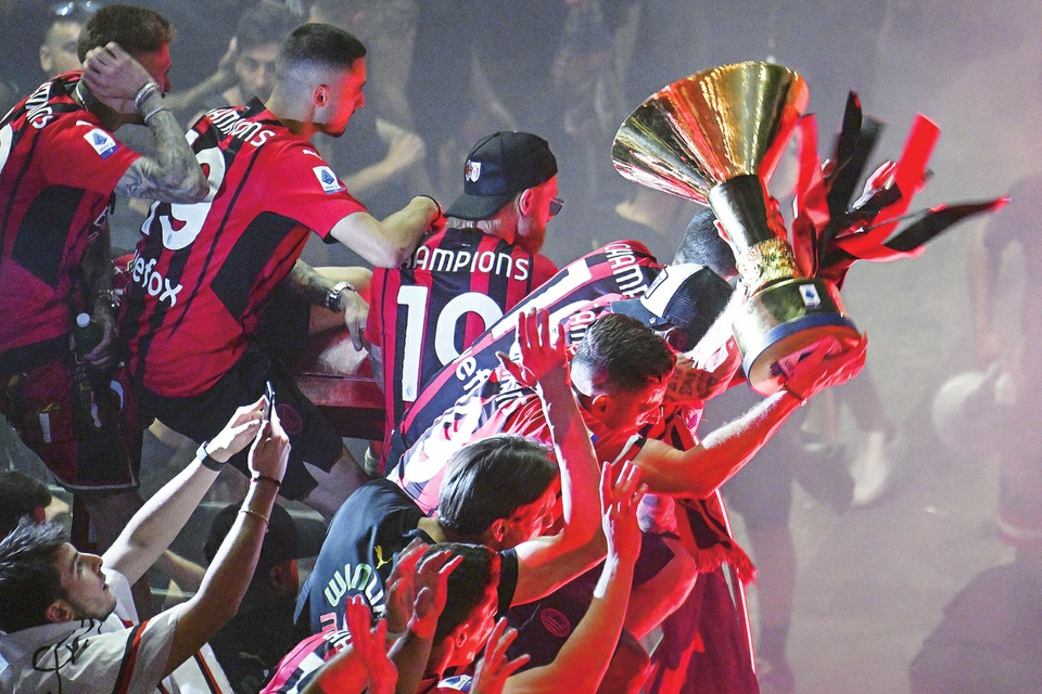 5月23日,AC米兰队成员高举奖杯与球迷共庆夺冠。新华社发(阿尔贝托·林格利亚摄)