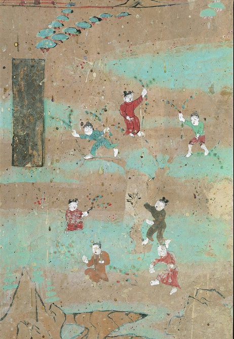 此外,壁画还记录下古代儿童采花、追逐、戏水等充满童趣的画面。藏经洞出土文献中,也有玩弹弓、捉蝴蝶、放纸鹤等游戏内容。