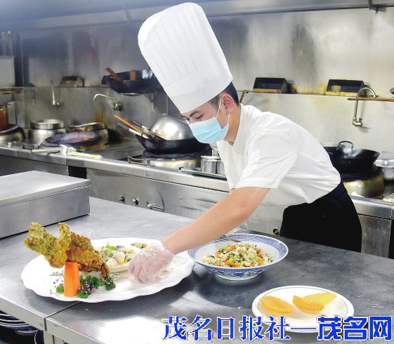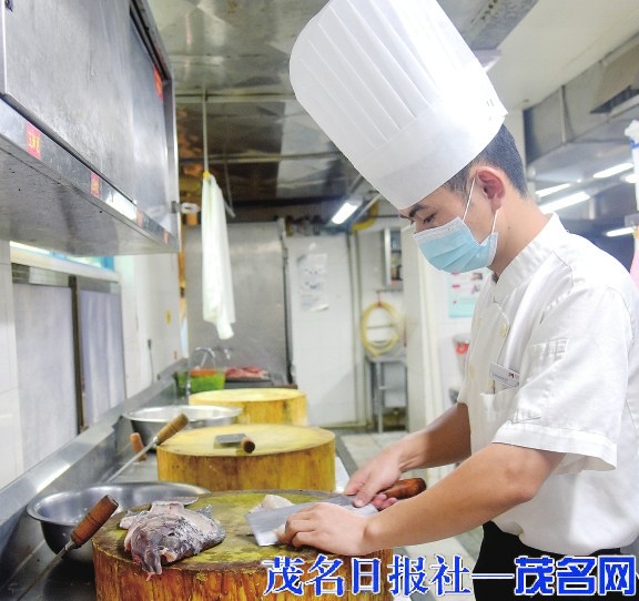 菜刀和案板发出“嘣嘣”声,炒锅和铁铲发出“铿铿”声,食材与滚油发出“刺啦”声……“00后”宗庆基一手掌勺、一手颠锅,在茂名国际大酒店后厨烹制拿手菜品“鱼跃龙门”。焯过水的鱼肉与吸收虾汤的蛋羹一起入口,色香味浓,“清、鲜、爽、嫩、滑”完美呈现,凭借这样的手艺,2021年宗庆基在茂名市第二届“粤菜师傅”技能大赛中,获得粤菜传承组中式烹调项目一等奖,现在是茂名国际大酒店的实习厨师。