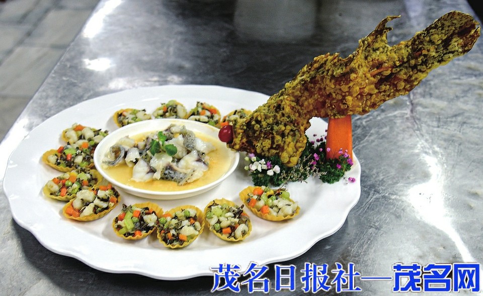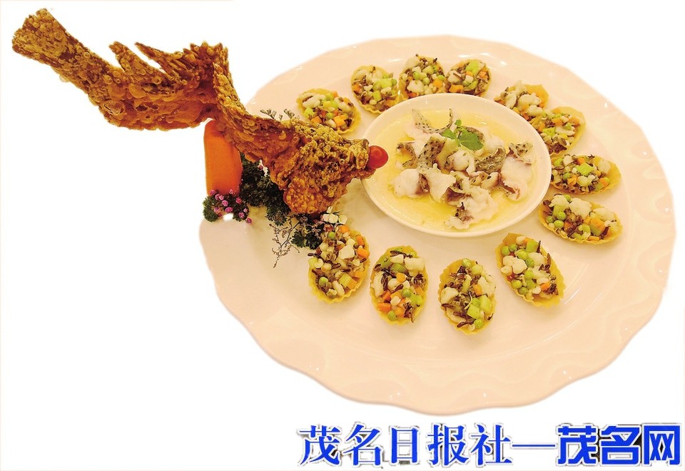做法是罗非鱼去骨取肉,骨身裹上鸡蛋液、生粉,牙签固定炸至金黄色,一条摇摆着跃龙门的鱼就成型了。鱼肉一半切成鱼片焯水,考究师傅对火候和时间的掌握。为提升菜品的整体鲜味,“虾汤蛋羹”是关键,利用海虾熬出的高汤与蛋清按照1比1的比例蒸7分钟。鱼肉铺在羹上,一口刚好熟透的鱼肉入口,满嘴软嫩鲜脆,经过反复清洗腌制后腥味全无。把鱼肉和蛋羹混着吃,“清、鲜、爽、嫩、滑”体现得淋漓尽致,食材巧妙融合,蛋羹中吸收海虾的鲜味,鱼肉中又含有蛋羹的柔软香甜,好吃到把舌头咬掉。另外一半鱼肉打做鱼蓉,与焯水后的西芹粒、茨实、胡萝卜粒、青豆粒大火爆炒,分装在用春卷做成的小盒里,一口咬下去既有春卷的酥脆,又有鱼蓉的弹口鲜香,西芹粒、茨实、胡萝卜粒、青豆粒在舌尖上“跳舞”,口感十分丰富,让人忍不住再来一口。整道“鱼跃龙门”具有多层次口感,味道一绝,摆盘精美,让人一吃难忘。