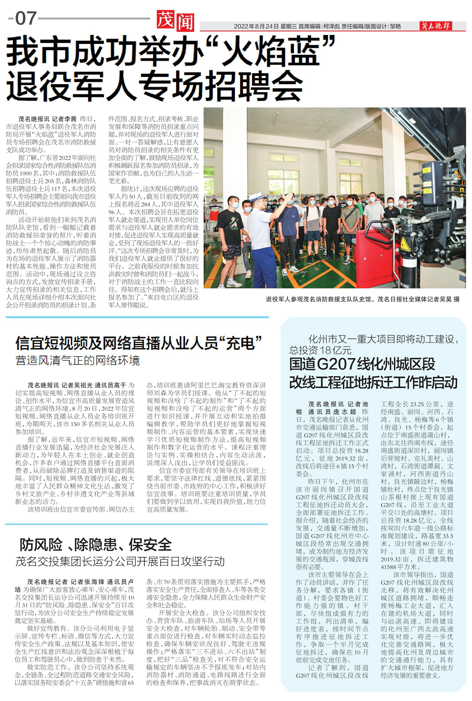 茂名晚报讯记者李茜 昨日,市退役军人事务局联合茂名市消防局开展“火焰蓝”退役军人消防员专场招聘会在茂名市消防救援支队成功举办。
