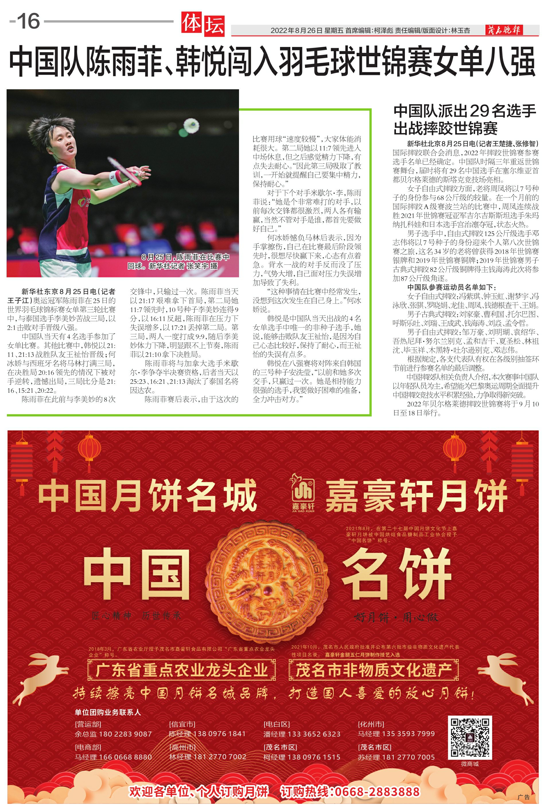 中国队陈雨菲、韩悦闯入羽毛球世锦赛女单八强
