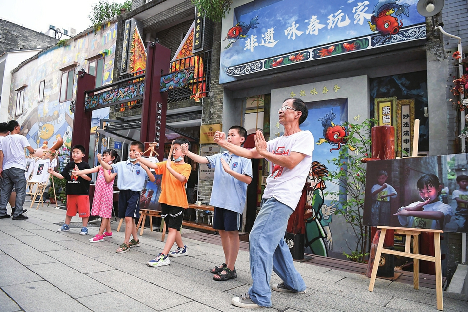 2022年7月18日,孩子们在广州永庆坊体验咏春拳。新华社记者邓华摄
