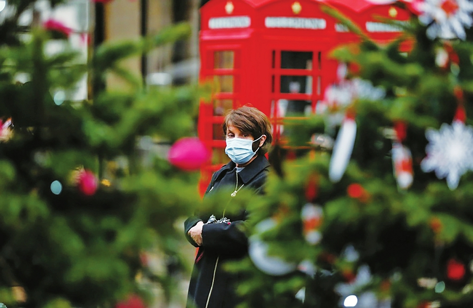 一名戴口罩的女子从英国伦敦街头的圣诞树旁走过。新华社记者韩岩摄