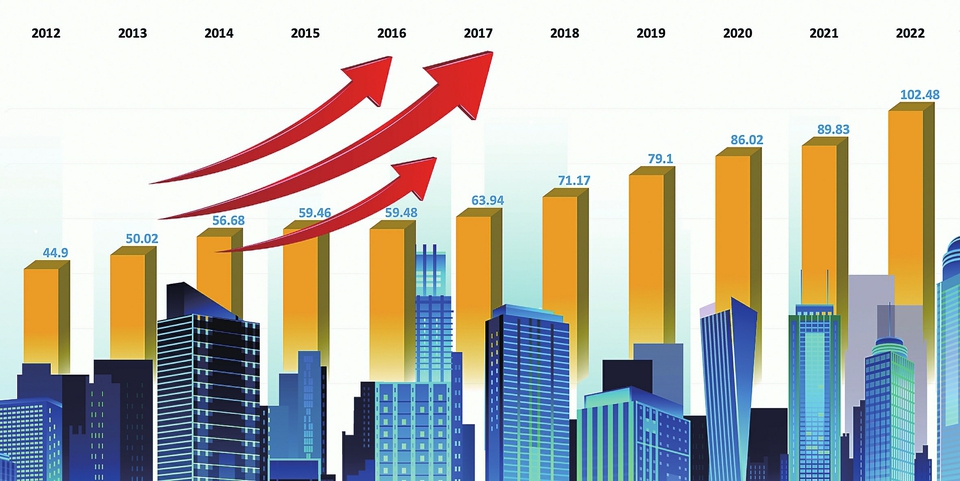 2012-2022年中国企业500强营业收入总额(万亿元)变化趋势记者潘悦制图