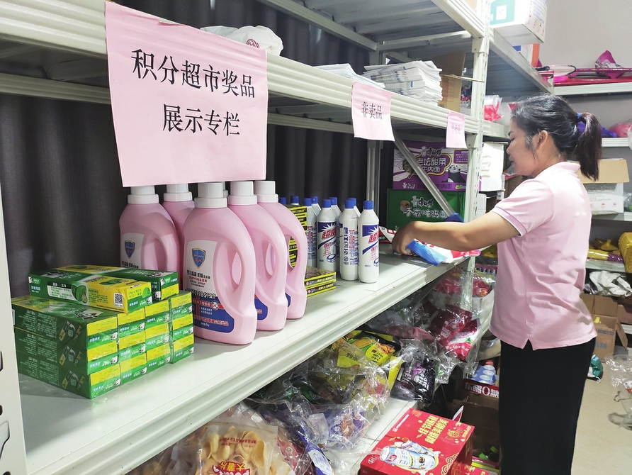 工作人员在整理积分超市的货架。 茂名晚报记者池榕摄