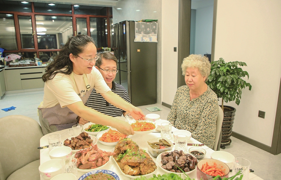 在莫力达瓦达斡尔族自治旗纳文慕仁社区,陈秋红(左一)为婆婆做了辣白菜,一家人团圆过中秋。(新华社发)