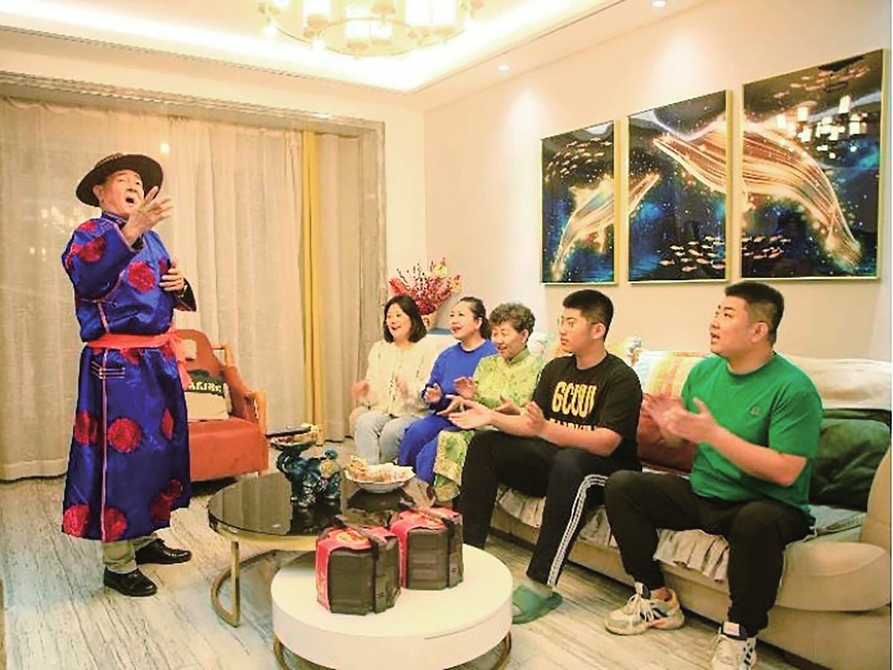 “十五的月亮,升上了天空哟……”今年64岁、身着蓝色蒙古袍的白俊岐,轻声哼唱蒙古语歌曲。老伴索淑琴身着漂亮的达斡尔族传统服饰,带领着儿孙们用掌声为白俊岐伴奏。中秋节这一天,悠扬的歌声飘荡在客厅里,将一个多民族组成的家庭紧紧凝聚在一起。此情此景,像极了茶几上的五仁月饼,圆圆满满、甜甜美美。