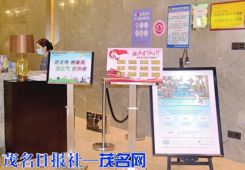 茂名晚报讯记者潘宇丽 大堂内整洁明亮,服务人员热情周到,各类文明公益广告放眼可见……茂名开展创建全国文明城市工作以来,茂名温德姆至尊酒店不断升级优化硬件设施和服务品质,深入细致开展文明住店、文明用餐等文明推广活动,积极打造文明酒店示范点,擦亮文明城市窗口,做创文工作的宣传者和实践者,得到许多市民好评。