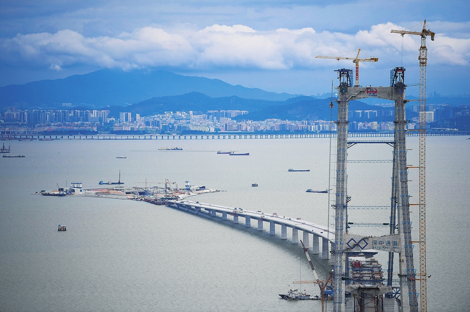 2022年6月7日拍摄的深中通道伶仃洋大桥东塔、西人工岛及远处的深圳市区。 新华社记者邓华摄
