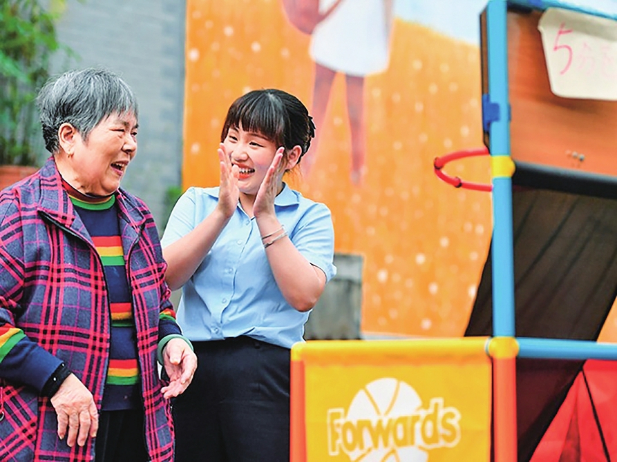 在湖南省湘潭市雨湖区窑湾街道综合养老服务中心,养老护理员刘梦为投进了球的老人鼓掌庆贺。 (2022 年 5月17日陈泽国摄)