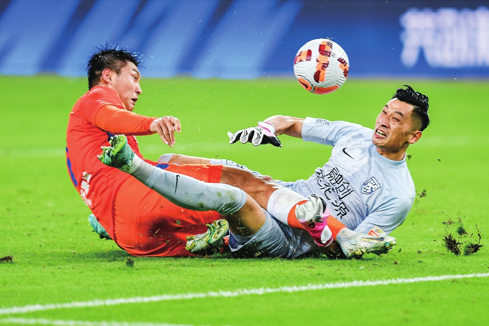 9月14日,武汉三镇队守门员吴飞(右)与山东泰山队球员郭田雨在比赛中拼抢。当日,在山东济南举行的2022赛季中国足球协会超级联赛第18轮比赛中,山东泰山队主场以1比1战平武汉三镇队。