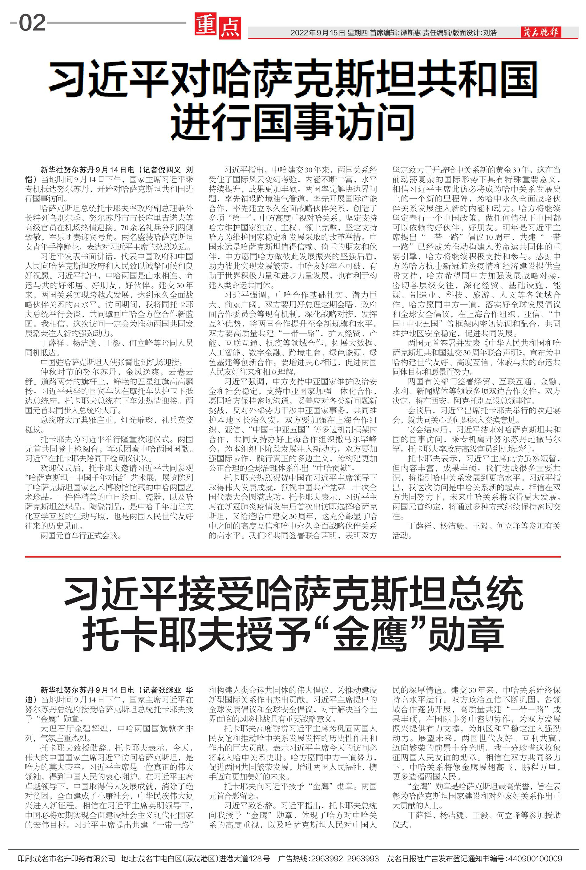 习近平接受哈萨克斯坦总统托卡耶夫授予“金鹰”勋章