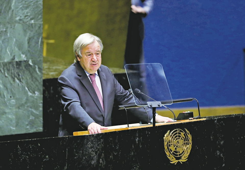 2022年9月13日,在位于纽约的联合国总部,联合国秘书长古特雷斯在第77届联合国大会第一次全会上致辞。 (新华社记者王迎摄)