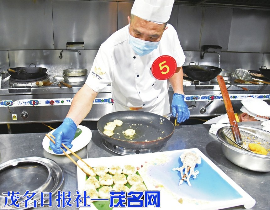 而在自选菜品烹饪环节,葭蒌叶香米焗大虾、脆皮和平鸽、荔园黄金卷、松仁香煎博贺墨鱼饼、黄皮酱香骨等佳肴,再次挑逗大家的味蕾。粤菜师傅们各出花招,红烧、爆炒、清蒸……让新式烹饪技巧与茂名传统食材擦出火花,将高凉美食的魅力和精髓表现得淋漓尽致。