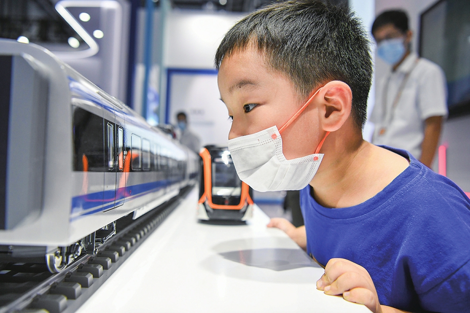 9月20日,在2022世界制造业大会上,小朋友在中国中车展台参观。新华社记者张端摄