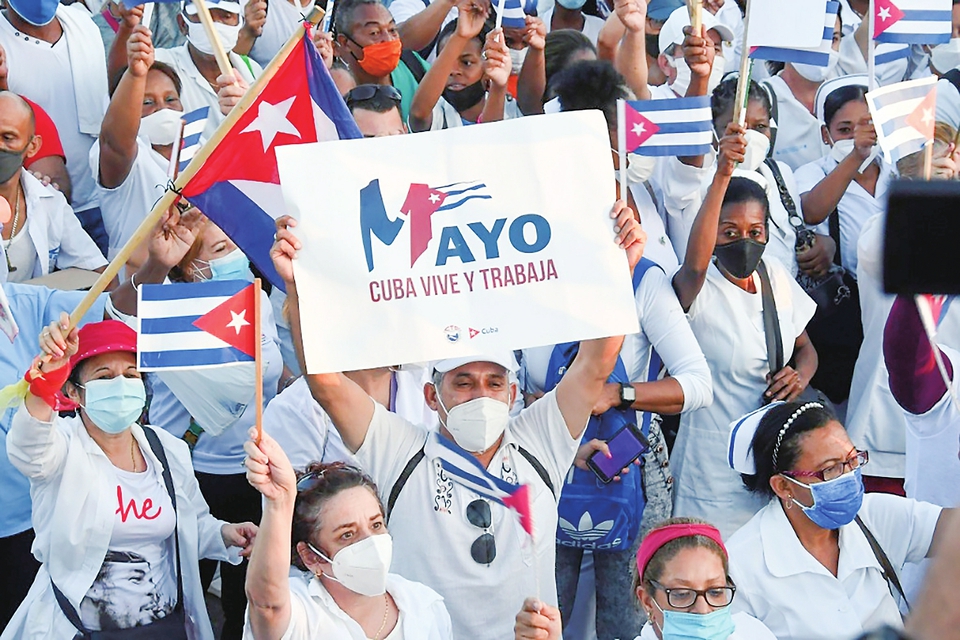 5月1日,古巴民众在哈瓦那参加“五一”国际劳动节集会游行,反对美国对古封锁。新华社发(华金·埃尔南德斯摄)