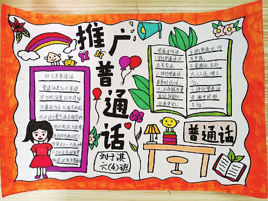 除了手抄报外,各班还围绕本次推普周的主题办黑板报。同学们用文字及图画记录下“推广普通话”的所思、所感、所悟,把自己的真情实感用画笔展示出来,创作出了一版版内容丰富、主题鲜明、形式多样的黑板报。在推普周活动期间,学校还通过宣传栏和电子宣传屏幕等加大宣传推广普通话的力度,增强师生语言规范意识,全力为推广普通话营造良好的推普氛围。